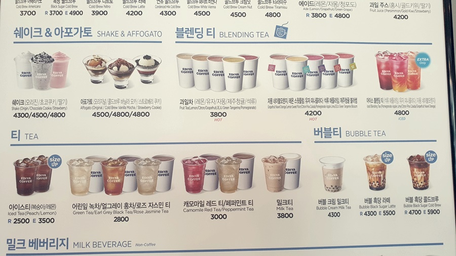 커피 종류 외에도 정말 다양한 메뉴들이 있어요. 쉐이크와 아포가토. 이것도 가격이 4300~4800원이에요. 마찬가지로 5천원이 넘어가지 않아요. 이외에 블렌딩 티, 티, 버블티등이 있어요. 버블티의 경우 4300원에서 4700이니까. 이 정도 가격이면 역시 다른 프랜차이즈의 버블티보다는 저렴한 편이죠. 이디야커피에서 가장 저렴한 음료는 아이스티인 것 같아요. 2500원이니까요. 요즘같은 여름에 마시기 딱 좋은 음료에요.