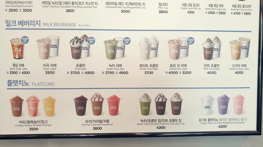 밀크 베버리지라고해서 우유가 들어간 음료들이 있어요. 흑당 라떼를 비롯해서. 제가 또 가끔씩 허기질 때 먹는 이곡 라떼도 있어요. 이곡 라떼는 다 좋은데 좀 단 것이 흠이기는 해요. 설탕 제외하고 좀 구수하게 만들면 제가 자주 마실텐데 말이에요. 한끼 간단한 식사로도 좋고요. 녹차라떼, 포키 넛 라떼, 고구마 라떼 등이 있어요. 밀크 베버리지는 3300~4000원까지 가격대가 형성이 되어 있어요. 플랫치노라고 해서 3500~4200원까지 가격이 형성되어 있어요.