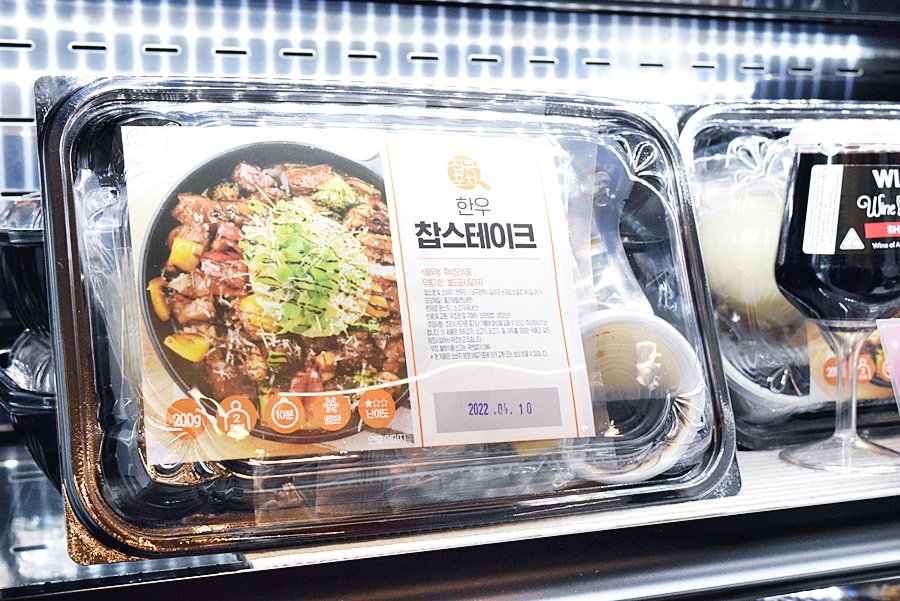 이번에 가서 구매를 해 온 찹스테이크에요. 다른 수입산 고기가 아니라 한우 찹스테이크에요. 이건 말 그대로 밀키트여서 집에 와서 조리만 하면 되요. 조리에 필요한 모든 재료들, 소스까지 다 들어있거든요. 한 마디로 불만 있으면 되니 진짜 편해요.
