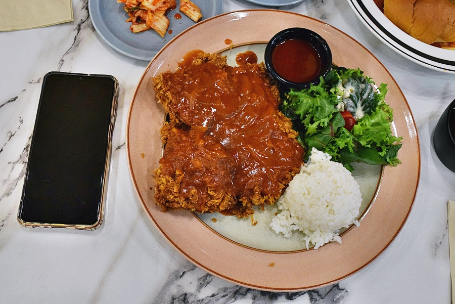이게 바로 치킨 돈가스에요. 일반 돼지고기가 아니라 닭고기로 만든 돈가스에요. 어떻게 보면 돈가스가 아니라 치킨가스라고 해야죠. 접시 크기가 정말 커요. 비교해보시라도 갤럭시폰 옆에 대봤는데요, 크기가 어느 정도인지 짐작이 가실 거에요. 정말 커요.