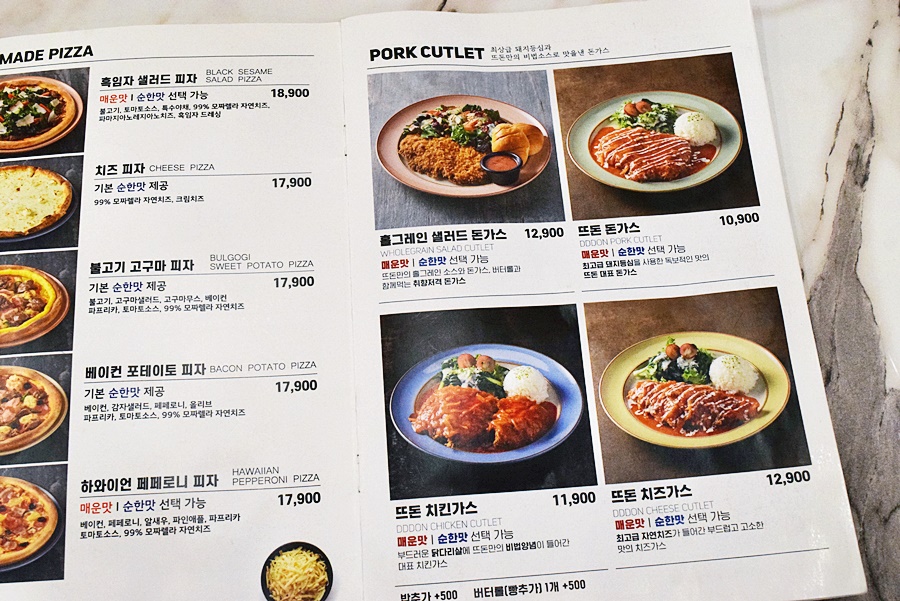 대구 돈가스 맛집이기때문에 돈가스 종류가 정말 많아요. 거기에다가 피자, 파스타, 샐러드 등 다양한 음식들이 있어요. 위에 메뉴판 돈가스는 일부이고요, 위 종류보다 더 많은 돈가스가 있어요. 이번에 저는 뜨돈 치킨가스로 먹었어요. 일반 돈가스보다 1천원이 더 비싼데요, 보다 특별한 맛을 즐길 수 있어요.