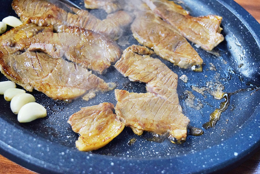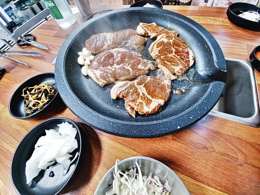 목살구이와 냉면을 주문했는데요, 우선 이렇게 목살구이부터 나와요. 양념이 제대로 된 목살구이인데요, 이걸 두꺼운 돌판위에서 지글지글 굽거든요. 고기 굽는 동안 침 꼴깍꼴깍 넘어가요. 이런 비주얼 아주 오랜만에 보는 것 같아요.