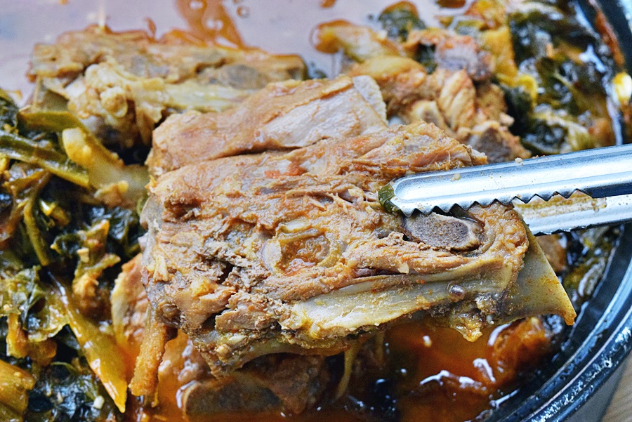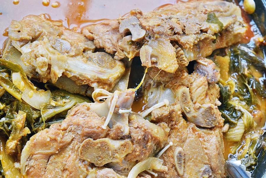 고기도 듬뿍 들어 있어요. 고기의 경우 이미 다 조리가 되어서 나오는 상태이기때문에 한번만 끓여서 야채들의 숨을 죽이고는 바로 먹으면 되거든요. 국물이 진하게 배어 있는 아주 맛있는 감자탕 고기에요. 뼈해장국의 고기가 역시 크기도 크고 양도 많더라고요.