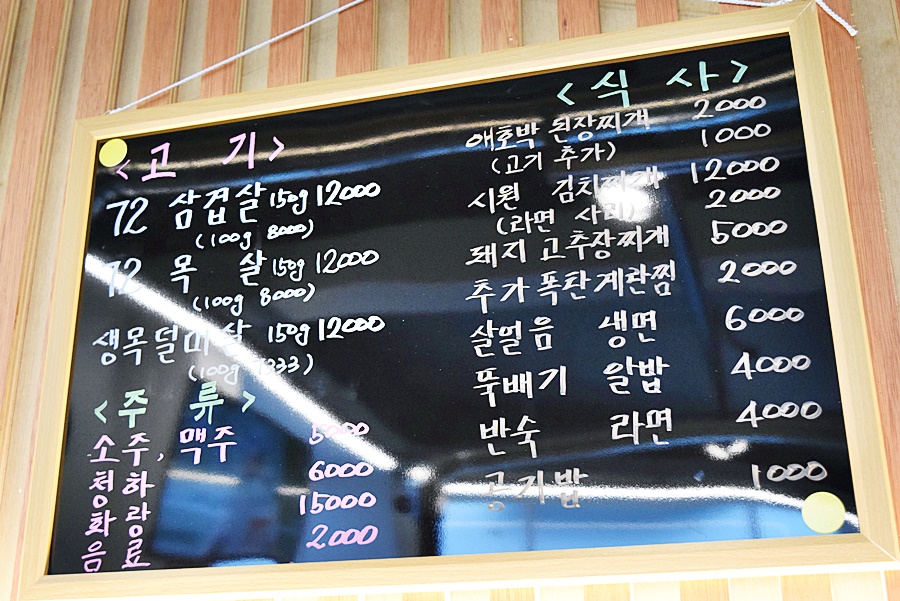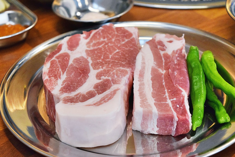 황삼에 오면 꼭 먹어야하는 것, 바로 삼겹살과 목살이에요. 가격은 100그램에 8천원이에요. 삼겹살 목살 가격이 동일해요. 생목덜미살이라는 특이한 부위도 있어요. 이번에 가서는 당연히 삼겹살과 목살을 주문했어요.