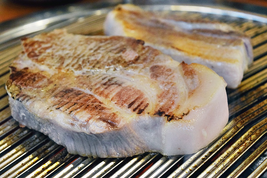 두툼한 고기이다보니 굽는데 약간 스킬이 필요해요. 일단 한쪽이 타지 않게 어느 정도 노릇노륵하게 구운 후에는 바로 뒤집어요. 그리고는 다시 노릇노릇하게 구운 후에는 잘라주죠. 그리고 나서 이제 속까지 구우면 되는데요, 삼겹살, 목살 모두 진짜 맛있게 구워지더라고요. 이런 고기는 역시 이렇게 숯에 구워야하거든요.