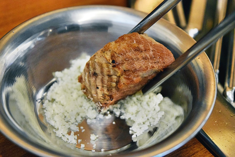 근래에 본 고기 중에서 가장 퀄리티가 높은 것 같아요. 생고기가 나오는데 진짜 감탄을 하게 되요. 이렇게 예쁜 숙성고기는 또 오랜만에 보는 것 같아요. 바로 달궈진 불판 위로 올리는데요, 치익하는 소리가 아주 실감나게 들리면서 고기가 빠르게 구워져요.