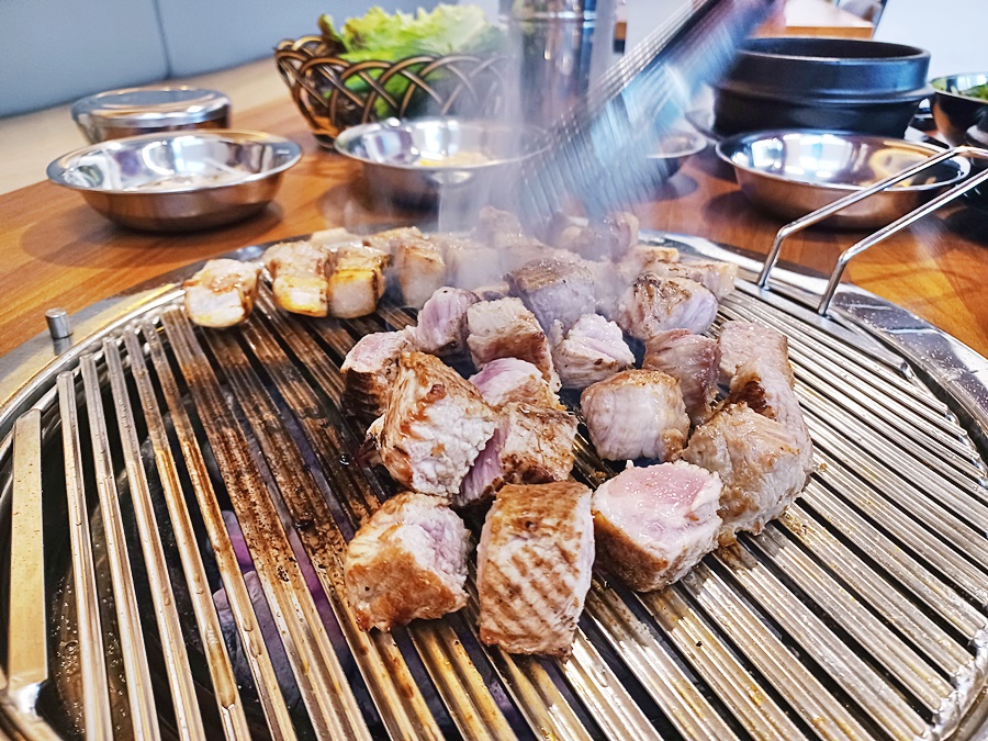 글을 쓰면서 지금 사진을 보면서 다시 침이 고이네요. 현장에서 맛 본 이 고기들이 진짜 맛있었거든요. 마치 즉석에서 스테이크를 구워서 먹는다고 할까요. 그러면서도 스테이크보다 더 부드럽고 식감도 연해요. 삼겹살과 고소함과 목살의 구수함을 제대로 느낄 수 있었어요.