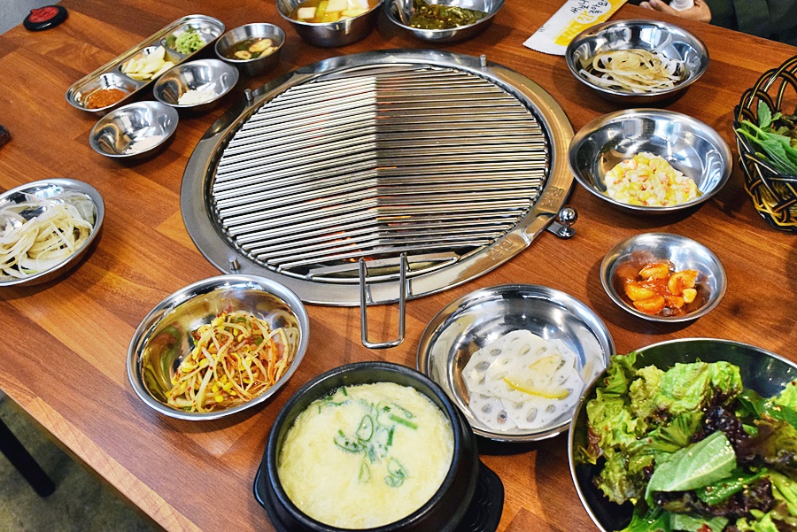 주문을 하면 바로 상이 차려져요. 가운데에는 숯이 들어와요. 숯도 아주 좋은 숯이에요. 불판도 굉장히 두툼한 불판이에요. 반찬 종류가 다양하면서도 하나 하나 맛이 있어요. 고기과 같이 먹을 수 있는 다양한 소스들도 나오고요. 쌈도 나오고 야채 저래기도 나와요.