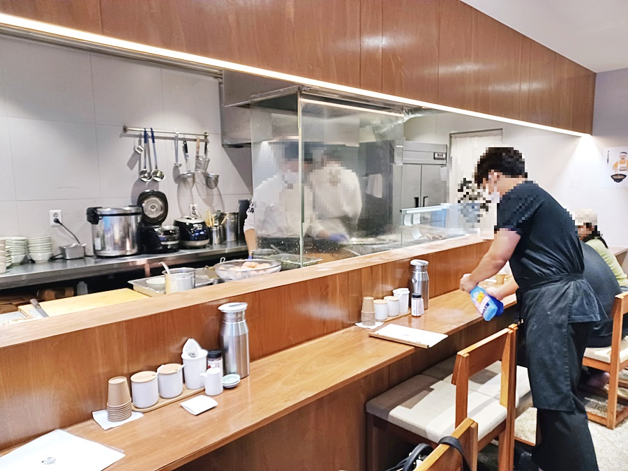 대원텐동은 1층에 있어요. 들어서면 공간이 꽤 넓다는 것을 알 수 있어요. 4인용 테이블도 몇개 놓여져 있고요, 일자로 된 테이블이 있어서 혼자 가서 텐동 먹기에도 좋은 곳이에요. 튀기는 장면을 바로 앞에서 볼 수 있어서 생동감이 아주 넘치는 것 같아요.