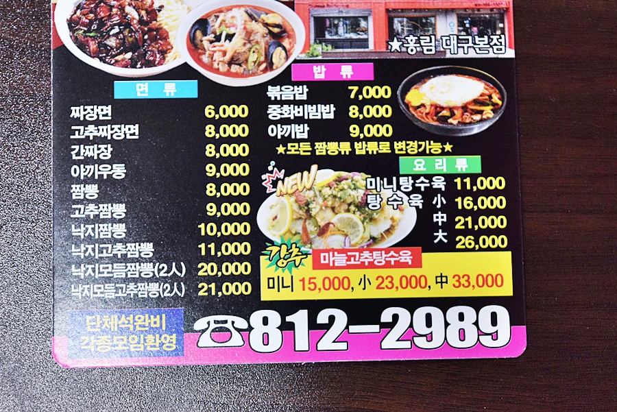 홍림 대구본점이라고 되어 있어요. 자장면은 6천원이에요. 짬뽕은 8천원이고요. 단체석도 있을만큼 규모가 큰 곳이니 연말 모임같은 것을 하기에도 좋아요. 다음에 가면 저도 짬뽕 먹어보려고요. 또한 고추자장면이라도 있는데요, 그것도 한번 먹어보려고요.