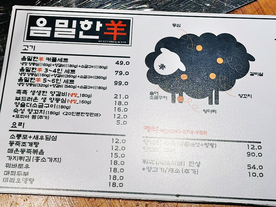 다양한 양고기들이 판매 되고 있어요. 양고기도 소고기처럼 다양한 부위가 있어요. 물론 소고기만큼 다양하지는 않은 것 같아요. 그림에 보면 갈비살, 양꼬치, 양다리, 숄더소금구이, 등심으로 표시가 되어 있는데요, 이 곳에서는 이렇듯 다양한 양고기를 먹을 수 있어요. 2~6인을 위한 세트 메뉴들도 있어요.
