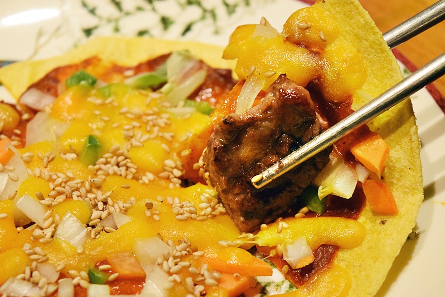 양고기로 끝이 아니에요. 이렇게 서비스 음식이 나오거든요. 또띠아처럼 보이기도하고 미니피자처럼 보이기도해요. 여기에다가 양고기를 싸서 먹으면 이것 또한 별미음식이더라고요. 양고기를 보다 맛있게 먹을 수 있는 방법이에요.