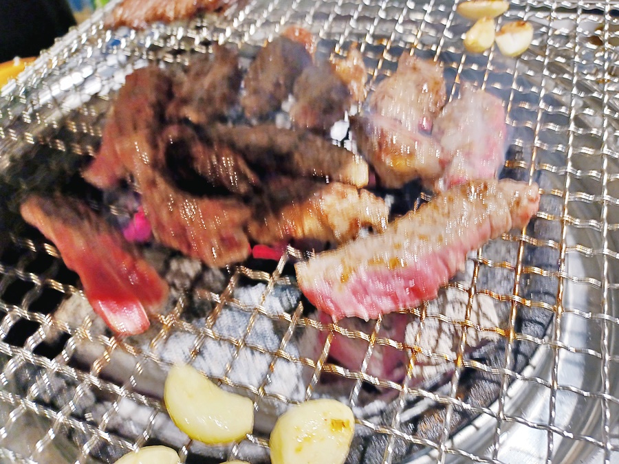 아주 영롱한 빛깔의 한우가 나왔다. 역시 수입산는 비교 불가이다. 한우의 색깔과 모양은 정말 특별하다. 한눈에 봐도 이것이 한우이다라고 할 수 있을만큼 한우의 특징은 선명하게 드러난다. 한우를 가스불에 굽는 것이 아니라 숯불에서 굽는다. 역시 고기는 숯불에 구워야 제맛인 것 같다.