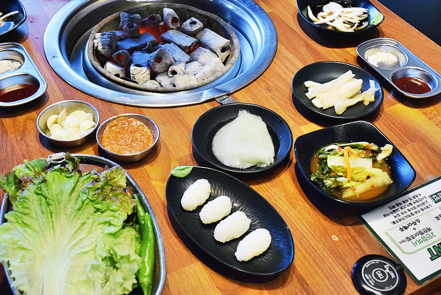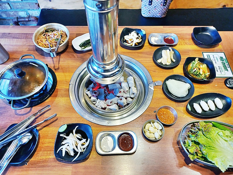 가운데 숯불이 올라오고 이렇게 한상이 차려졌어요. 여러가지 음식들이 다양하게 나와요. 된장국도 하나 서비스가 나와요. 숯불 옆에 보면 별도의 버너가 조그맣게 따로 있어요. 여기에다가 된장국 끓여서 먹거든요. 이건 서비스로 나오는 것이에요. 그 외에도 고기와 같이 먹을 수 있는 다양한 소스 반찬들이 같이 나와요.