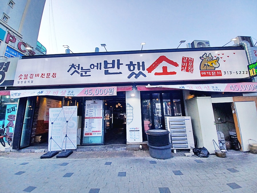 숯불갈비전문점 첫눈에반했소에요. 여기는 프랜차이즈같아요. 대구 다른 지역에도 지점들이 몇군데 있어요. 대구 북구 태전동에도 한군데가 있어요. 아래 지도 보세요. 주차장은 따로 없더라고요. 바로 앞 대로변이나 뒷편 골목에 주차할 공간들이 있어서 어렵지 않게 주차하고 왔어요. 좌석도 상당히 많고 단체를 위한 자리도 있는 곳이에요.