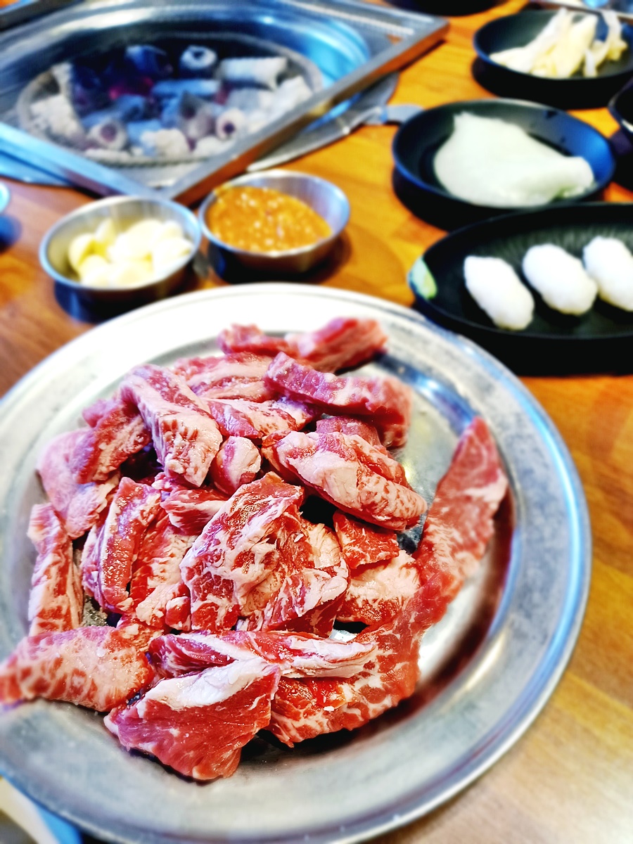 여기는 좀 특별한 메뉴도 있어요. 소고기와 함께 가리비를 먹을 수 있거든요. 가리비 좋아하시면 소고기와 같이 구워서 먹어도 좋을 것 같아요. 이번에 저는 갈비살 주문해서 먹었어요. 식당 안에 보면 냉장고가 따로 있어요. 이것을 숙성고라고 하더라고요. 고기 숙성하는 장소가 따로 있고 또한 이것을 이렇게 투명하게 운영을 하기 때문에 더 믿고 먹을 수 있는 고깃집이에요.