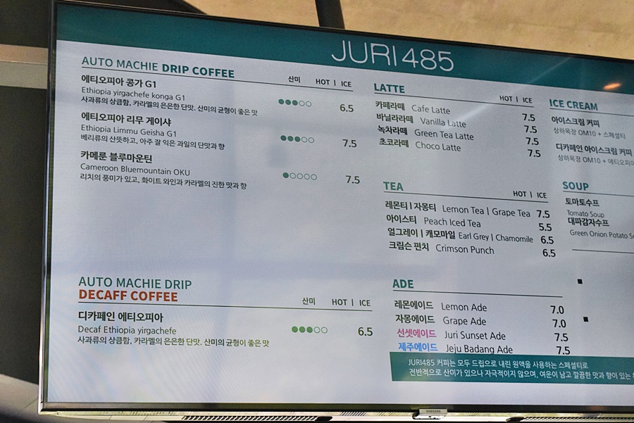 주리485 커피를 포함한 음료 메뉴 가격이에요. 여기는 드립커피도 있고 라떼, 차 등 다양한 음료들이 있어요. 가격대는 좀 있어요. 아무래도 대형카페이고 시설이 잘 되어 있다보니 어느 정도 가격대는 생각을 해야해요. 하지만 커피는 모두 드립으로 내린 원액을 사용한다고하니 그만한 값어치가 있어요.