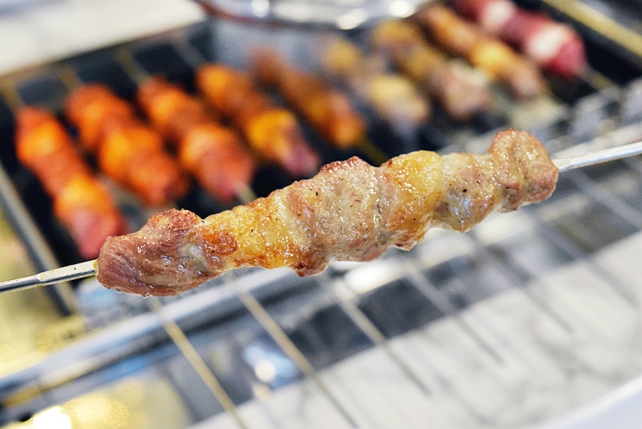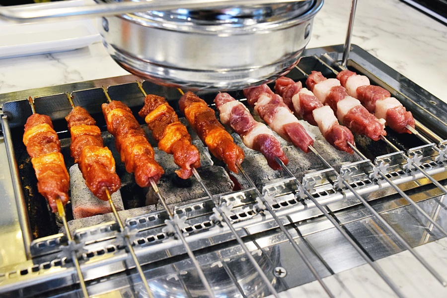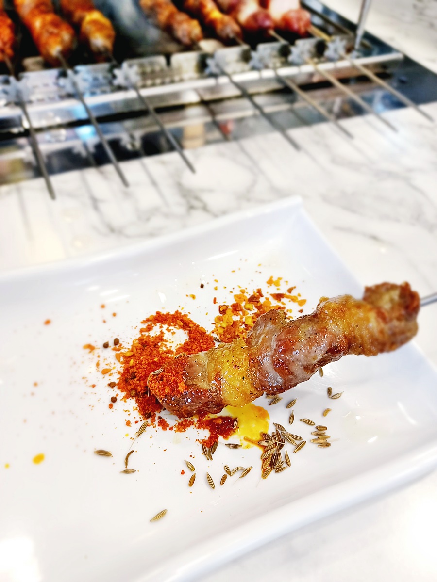양꼬치는 이렇게 기계에 올려놓으면 저절로 구워져서 좋은 것 같아요. 숯불 위에서 구워요. 양고기 자체에서 나오는 기름이 밑으로 쭉 쭉 빠져요. 그래서 이렇게 구워서 먹으면 더 담백하고 맛있게 먹을 수 있어요. 돌아가면서 저절로 구워주기때문에 굽는 수고가 따로 필요없어서 좋아요.