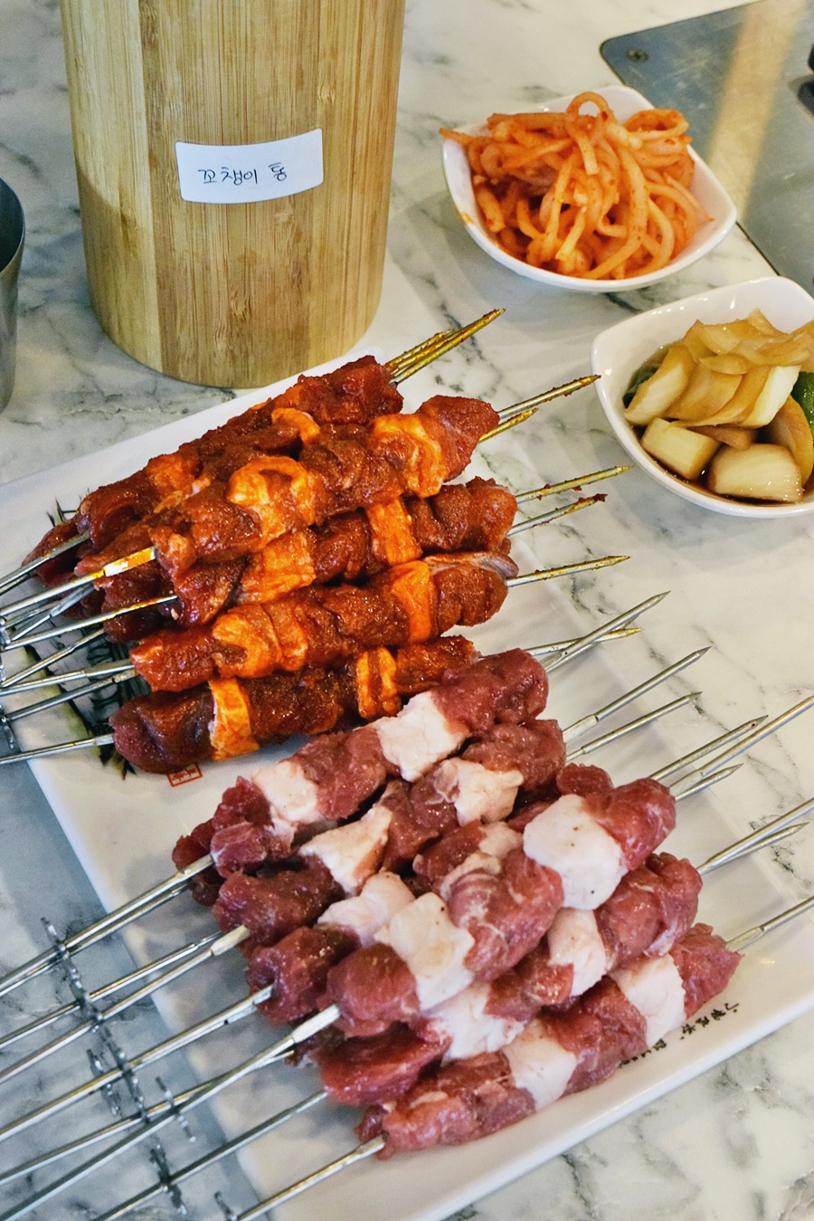 양꼬치 2인분을 주문했어요. 2인분을 주문하면서 그냥 한종류가 아니라 양념 반, 그냥 반으로 주문을 했어요. 둘이 가면 이렇게 주문해서 먹는 것이 가장 좋은 것 같아요. 두가지 맛을 한꺼번에 먹을 수 있으니까요. 양꼬치는 손이 많이 가는 음식이기도해요. 일일이 양고기를 손질해서 꼬치에 다 끼워야하죠. 그래서 정성이 느껴지는 음식이에요.