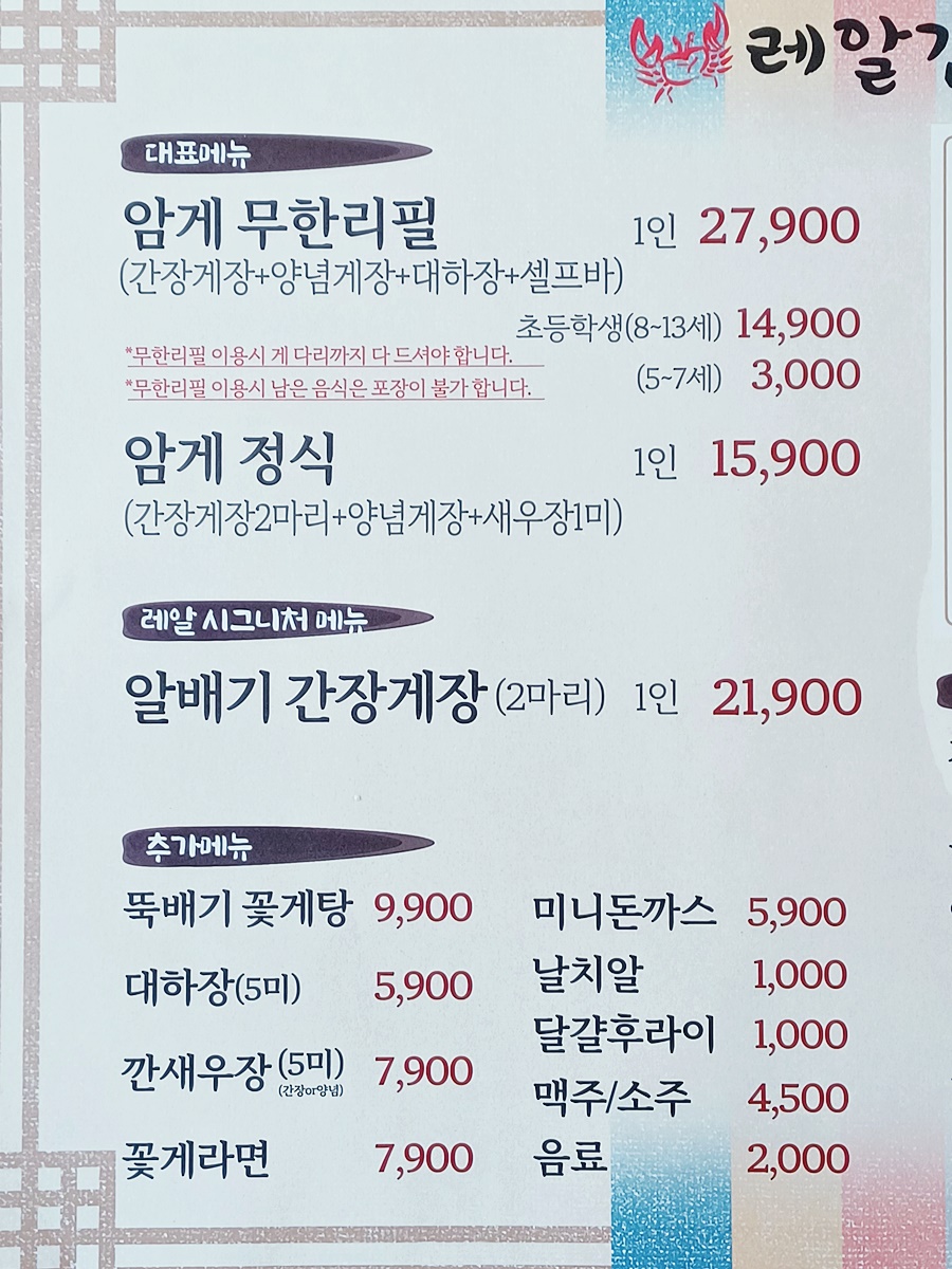 여기는 또한 주차장도 가게 앞에 있어요. 넓지는 않아도 3~4대 정도 주차 가능하니 그것도 고맙더라고요. 1인당 27,900원이에요. 이 가격만 지불하면 그 다음부터는 간장게장, 양념게장, 대하장 즉 새우장까지 모두 무한리필에요. 여기에다가 반찬, 밥, 국까지 다 나오거든요. 그러니 푸짐하게 먹을 수 있어요. 1인 가격이니 혼자 오셔서 간장게장 무한리필 드시는 분들도 있더라고요.