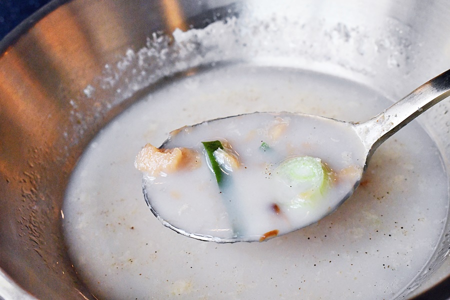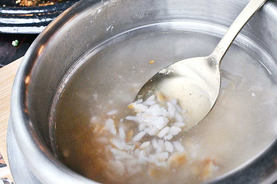 솥밥의 장점이 또 하나 있어요. 물을 부어놓으면 나중에 숭늉을 먹을 수 있다는 것이에요. 일단 밥 덜고 솥에다가 물 부어놓고 뚜껑 닫아요. 여기 또 진국을 내주시거든요. 진국까지 포함된 메뉴로 드세요. 이 진국이 정말 맛있어요. 구수하고 진해요. 조미료 없이 이런 맛 내기 쉽지 않거든요.