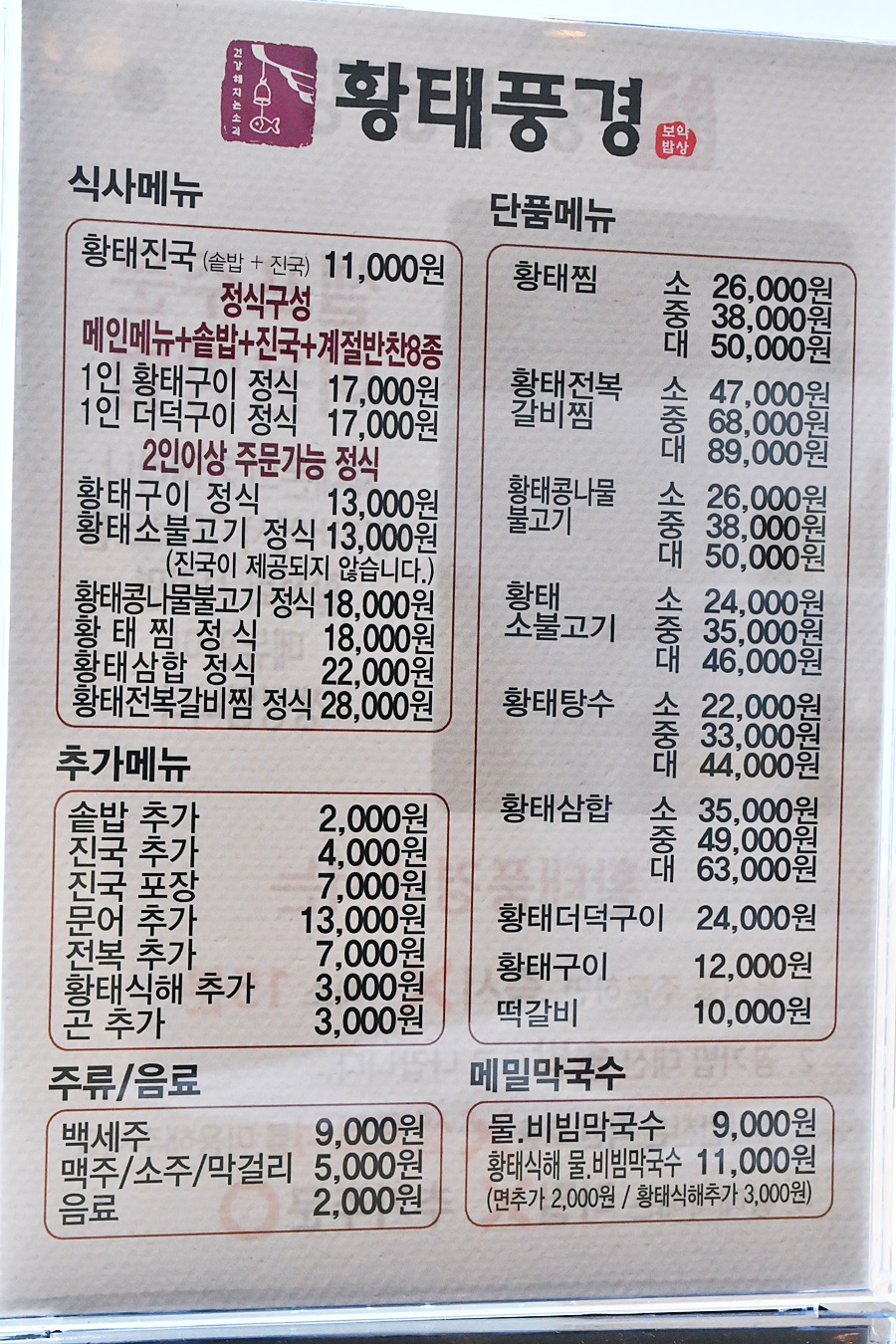 황태풍경에는 정말 다양한 한식 메뉴가 있어요. 그 중에서도 역시 황태구이 전문이에요. 점심때 갔어요. 황태구이정식과 더덕구이 정식을 각각 1개씩 주문했어요. 이렇게 주문이 가능해요. 황태구이 뿐만 아니라 황태찜, 황태전복, 황태소불고기 등등 다양한 메뉴들이 있어요.