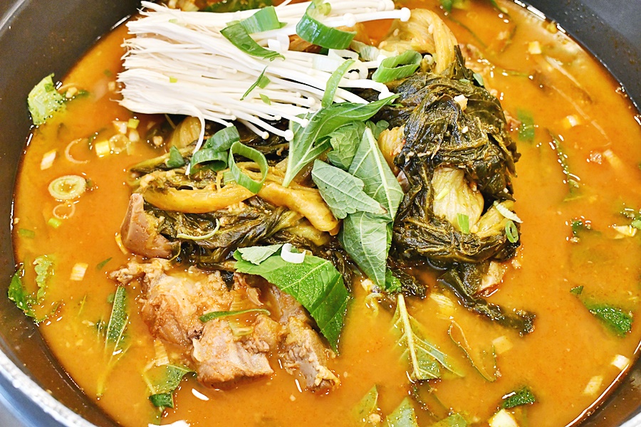 감자탕은 역시 우거지, 시래기 등과 같이 먹어야 더 맛있어요. 여기도 우거지인 것 같은데요, 상당히 많이 들어 있어서 더 좋더라고요. 부드러운 우거지하고 더 부드러운 고기까지하면 진짜 맛있는 감자탕이에요. 감자탕을 먹는 이유이기도해요. 대가대 감자탕 맛집 추천해요.