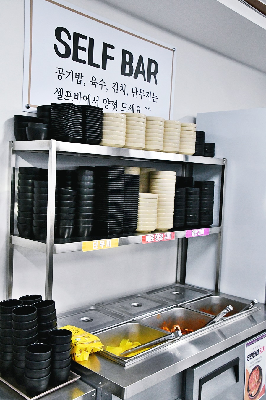 매장 한쪽에 보면 셀프바가 있어요. 여기는 공기밥, 육수, 김치, 단무지가 서비스로 나와요. 그러니 더 가성비가 좋은 곳이에요. 김치도 두가지가 있어요. 매운 김치와 일반 김치가 있더라고요. 국수 먹을 때 김치 많이 먹게 되는데요, 이렇게 셀프바가 있으니 진짜 좋더라고요.